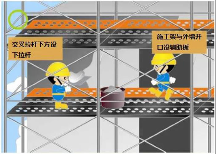 (3)設(shè)置安全網(wǎng)。凡無外架防護(hù)作業(yè)點(diǎn),必須在離地4m高處搭設(shè)固定的安全平網(wǎng),高層施工還應(yīng)隔四層再安一道固定的安全平網(wǎng),并同時(shí)設(shè)一層隨墻體逐層上升的安全平網(wǎng)。